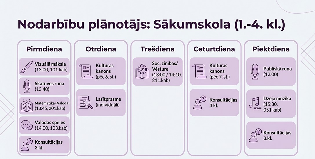 Projekta "Vienota skola" pašvaldības piešķirtā papildu finansējuma ietvaros 2025./2026. mācību gada otrajā semestrī Rīgas 88. vidusskola piedāvā papildu konsultācijas un nodarbības 1.9. klašu skolēniem.