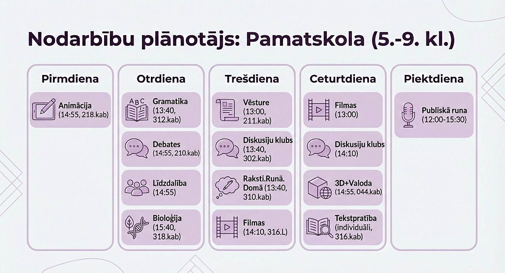 Aicinām skolēnus un viņu vecākus iepazīties ar nodarbību piedāvājumu, uzrunāt skolotājus un individuāli pieteikties sev interesējošajām nodarbībām.