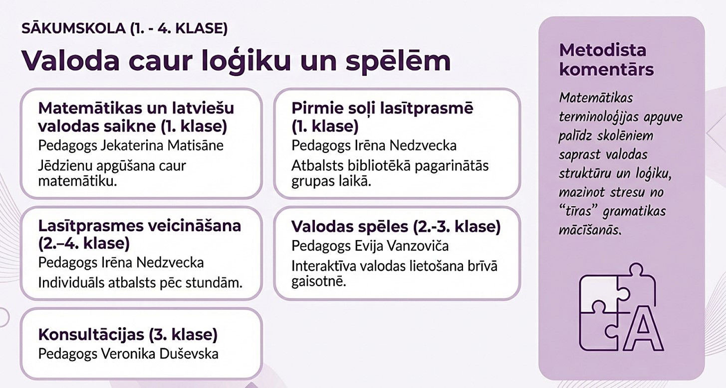 Praktisku uzdevumu un sadarbības aktivitāšu procesā tiek attīstīta prasme skaidri izteikties, analizēt informāciju un aktīvi iesaistīties mācību darbā.