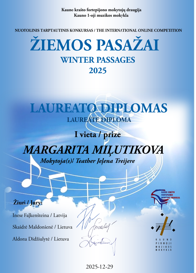 Dmitrijs Smirnovs (6.C) un Margarita Miļutikova (8.C) piedalījas Starptautiskajā tiešsaites konkursā "Ziemas ceļojums 2025" ("WINTER PASSAGES 2025") , kuru organizēja Kauņas Klavierskolotāju asociācija.