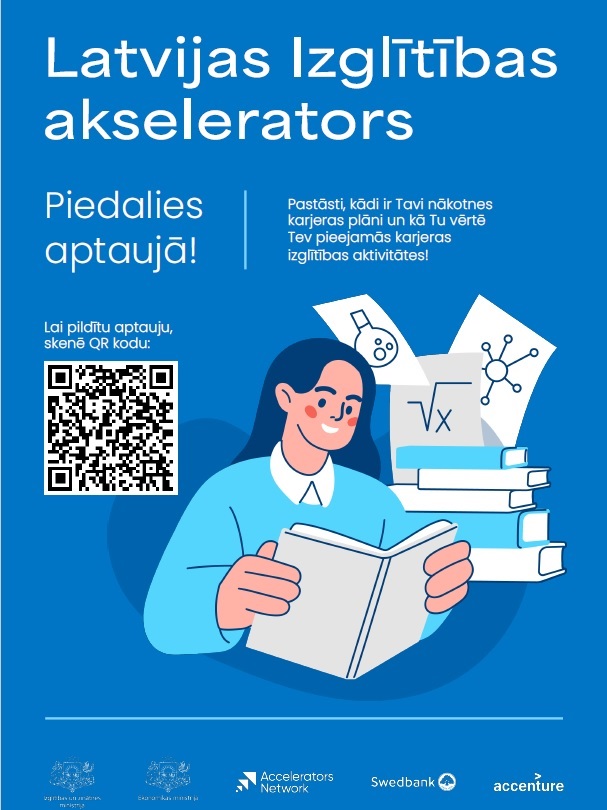 Latvijas Izglītības akseleratora ietvaros no š.g. 24. novembra līdz 5. decembrim tiek veikta aptauja par vidusskolas vecuma jauniešu nākotnes karjeras izvēlēm un karjeras izglītības kvalitāti Latvijā.