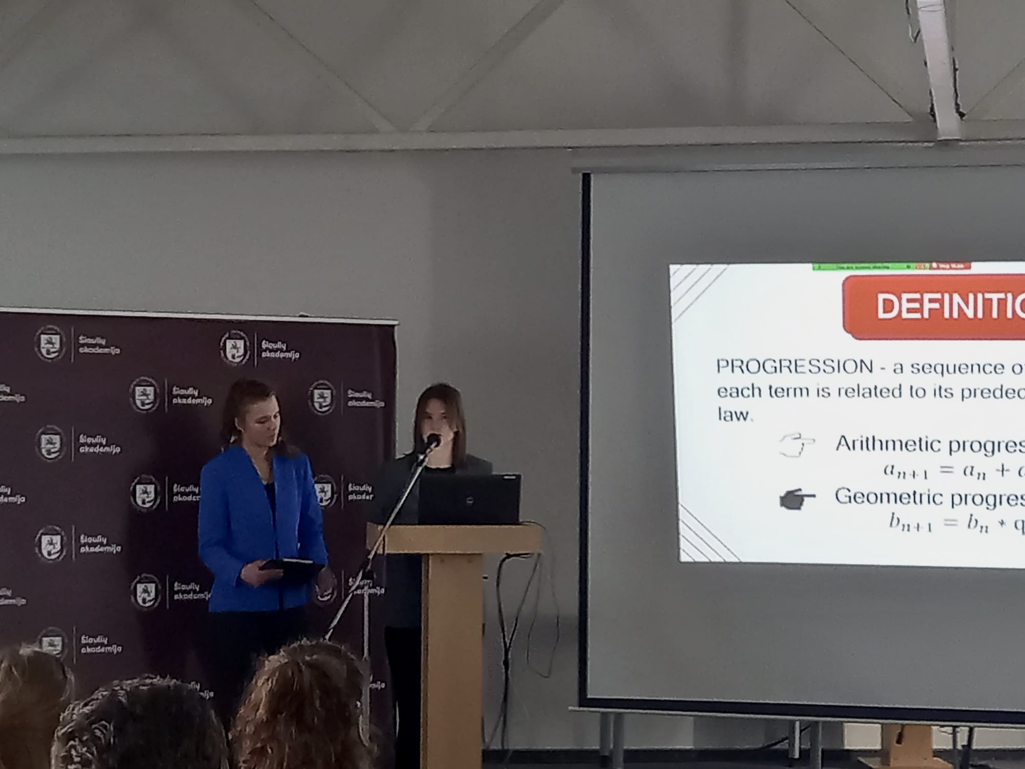 11.a klases skolnieces Anna Marija Dudņika un Anastasija Žigalova ar darbu "Progresija ikdienā";