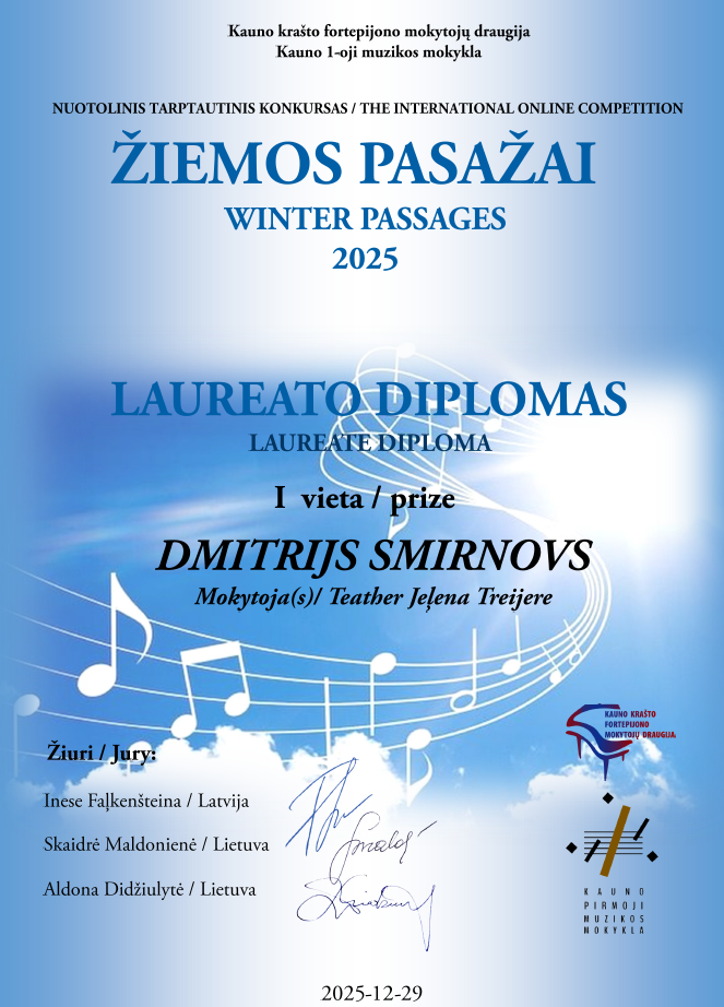 Dmitrijs Smirnovs (6.C) un Margarita Miļutikova (8.C) piedalījas Starptautiskajā tiešsaites konkursā "Ziemas ceļojums 2025" ("WINTER PASSAGES 2025") , kuru organizēja Kauņas Klavierskolotāju asociācija.