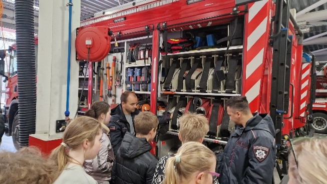Skolēniem bija iespēja piemērīt ugunsdzēsēju tērpu, izpētīt ugunsdzēsēju mašīnu aprīkojumu, to pielietojumu, apskatīt dispečeru telpu.
