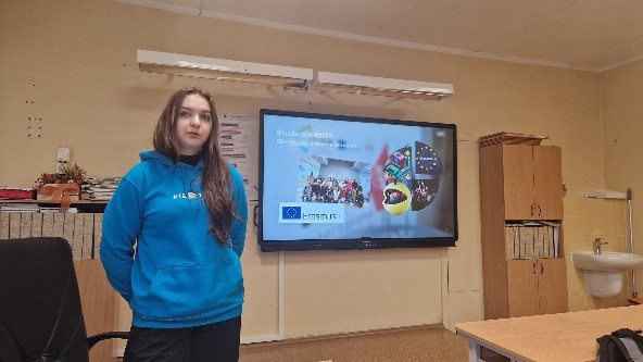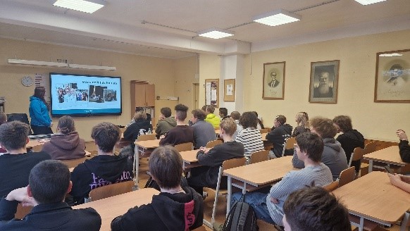 Tāpēc uz skolu bija uzaicināta vēstnese no Ekonomikas un kultūras augstskolas, kura dalījās savā pieredzē, prezentējot augstskolas mācību programmas..