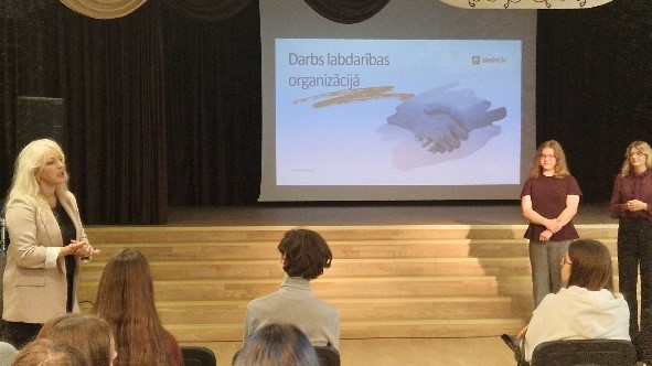 Skolēni uzzināja par organizācijas misiju, labdarības projektiem un brīvprātīgo darbu iespējām.