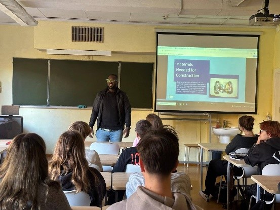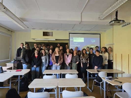 Lekciju apmeklēja 12.klašu skolēni, kuri ar interesi klausījās par ilgtspēju mašīnbūvē un pieprasītām profesijām nākotnē.